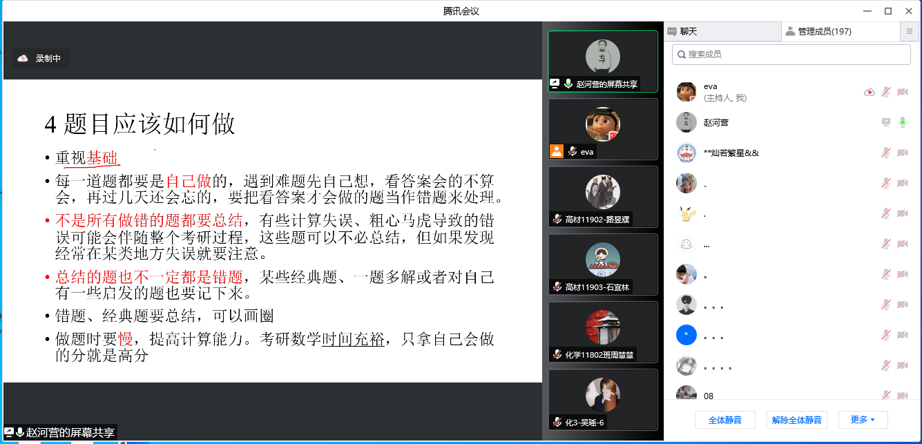 (通讯员:王宇奇)为进一步加深同学们对考研认知,帮助学生掌握科学的备考方法,提升他们的动力和信心,4月11日晚上7点,我院通过腾讯会议举办了化工学院18级考研经验分享会。本次会议由辅导员王娜老师主持,石东坡教授参会,18级考研学生代表钟建铭、周慧慧、赵河营、张静、解妍分享考研经验,学院19级、20级同学线上聆听。