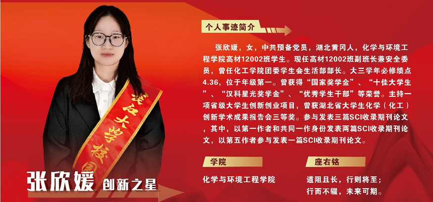 在米远祝老师以及实验室师兄师姐的指导和帮助下,在yl8858永利集团第八届“互联网+”大学生创新创业大赛,荣获金奖和铜奖;在yl8858永利集团第九届“互联网+”大学生创新创业大赛,荣获金奖和铜奖。同时,在湖北省第十六届大学生化学(化工) 学术创新成果报告会上获得三等奖,主持一项省级大学生创新创业项目。此外,在课题组研究中,她参与发表三篇SCI收录期刊论文。其中,以第一作者发表一篇二区SCI收录期刊论文,影响因子5.5;以共同一作发表一篇一区SCI收录期刊论文,影响因子5.2;以第五作者参与发表一篇二区SCI收录期刊论文,影响因子8.8。目前,个人累计影响因子达10.7。