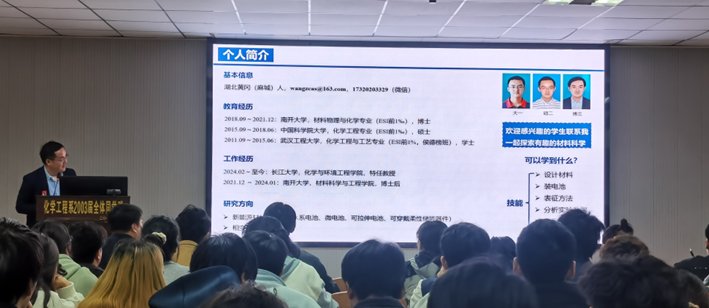 4月11日14:30,化工学院在14教北201会议室成功举办一场由化工学院特任教授王昭老师主讲,主题为“水系锌离子电池正极材料的改性及柔性应用研究”的学术报告。此次讲座旨在提升本院研究生的科研热情,增强其对热点电池材料的了解。学院副院长赖璐、学工办主任刘敬敏、辅导员王陈出席讲座,全体研究生到场聆听。