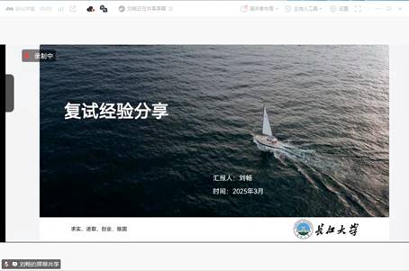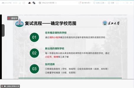 随后,三位去年成功上岸的校友依次分享了她们的考研复试及调剂经验。中国矿业大学(北京)的任晓骏同学从“信息获取渠道”入手,详细介绍了如何通过学校官网、研招网等途径获取复试和调剂信息。她强调,信息的及时性和准确性是成功的关键。福州大学的刘畅同学则聚焦“复试重点”,结合自身经历,分享了复试中专业课准备、英语口语表达以及面试技巧等方面的经验。她提醒同学们要充分展示自身优势,扬长避短。中国石油大学(北京)的高梦琳同学则围绕“调剂院校选择”和“导师联系”展开分享。她建议同学们在调剂时要结合自身实际情况,合理选择院校,并主动联系导师,表达自己的研究兴趣和诚意。三位校友的分享内容丰富、实用,为在场学子提供了宝贵的参考。