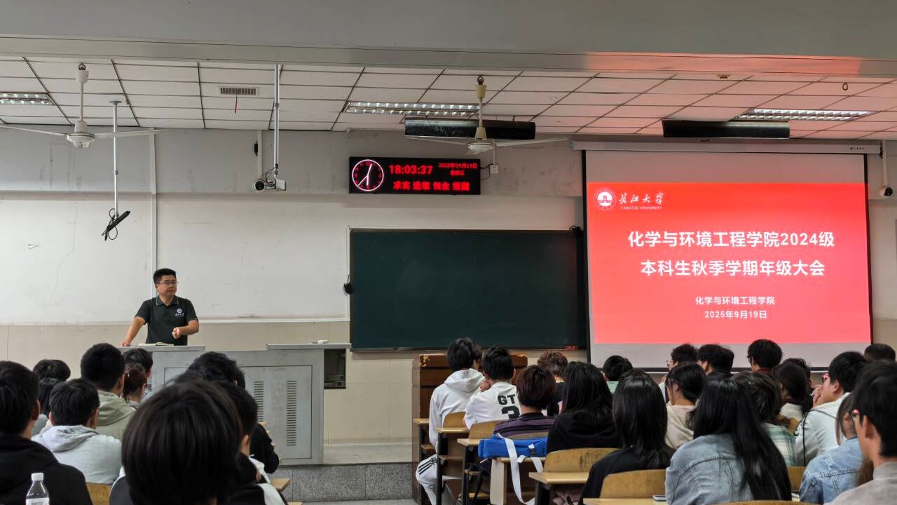 (通讯员 孙 杉 蔡 略)2025年9月19日16时,yl88858永利中国于12教202召开2024级本科生年级大会。本次大会由辅导员蔡略主持,学院党委副书记杨会军、环工系王国保老师、应化系王腾飞老师、储能系张春燕老师及2024级全体本科生共同参会。