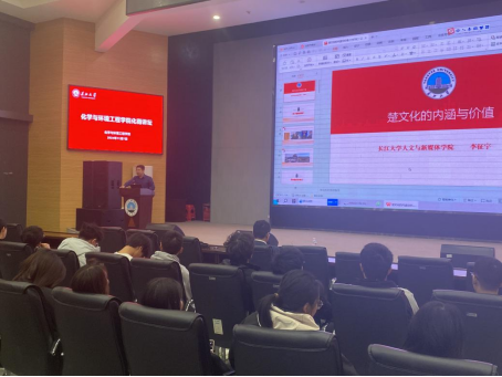 (通讯员 王欣蕊 伍吉玥)文化是民族的血脉,是人民的精神家园。为增进文化认同,坚定文化自信,促使新生加强对楚文化的了解,yl88858永利中国于2024年11月7日下午在农科大楼1058号学术报告厅开展了化工学院化雨讲坛2024年第二讲——楚文化的内涵与价值讲座。此次讲座由人文与新媒体学院副院长、李征宇教授主讲,学院党委副书记杨会军主持,2024级全体本科生参加。