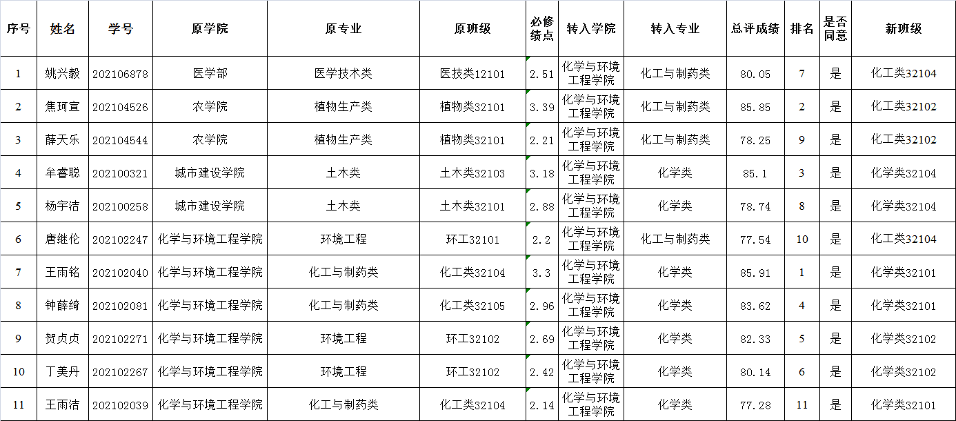 根据《yl8858永利集团普通本科生专业分流与转专业管理办法(试行)》(长大校发[2019]260号)文件精神和《关于2020级普通本科生春季学期转专业的通知》精神,化工学院本着“公开、公平、公正”的原则,对符合资格的申请转入我院相关专业的11名学生进行了面试,并按综合必修课程考试成绩占70%和面试成绩占30%的比例进行成绩汇总,结合我院接收计划确定拟接收11名学生转入。现将拟接收学生名单公示如下: