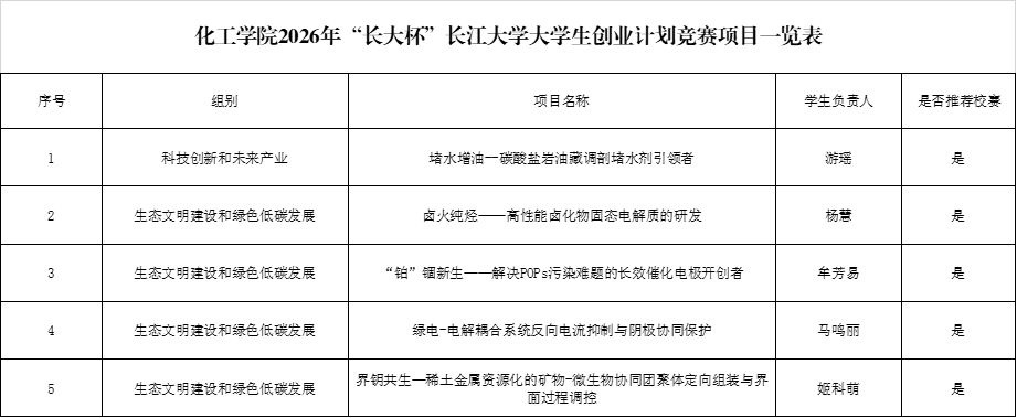 按照《关于举办2026年“长大杯”yl8858永利集团大学生创业计划竞赛暨“挑战杯”中国大学生创业计划竞赛校内选拔赛的通知》的要求,经过学生提交申请、学院答辩评审,拟推荐《堵水增油--碳酸盐岩油藏调剖堵水剂引领者》等5个项目申报校级挑战杯,具体名单如下。