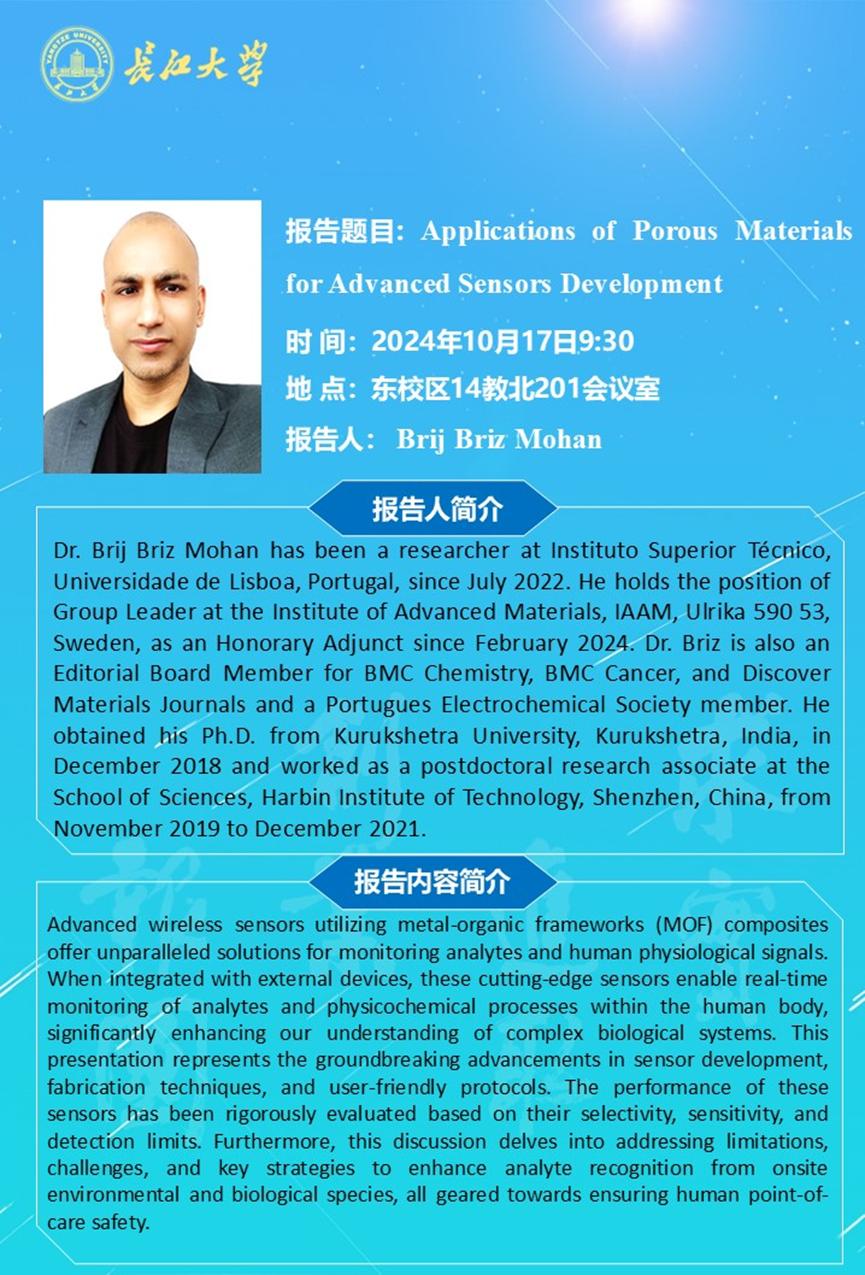 长江化工讲坛:Applications of Porous Materials for Advanced Sensors Development