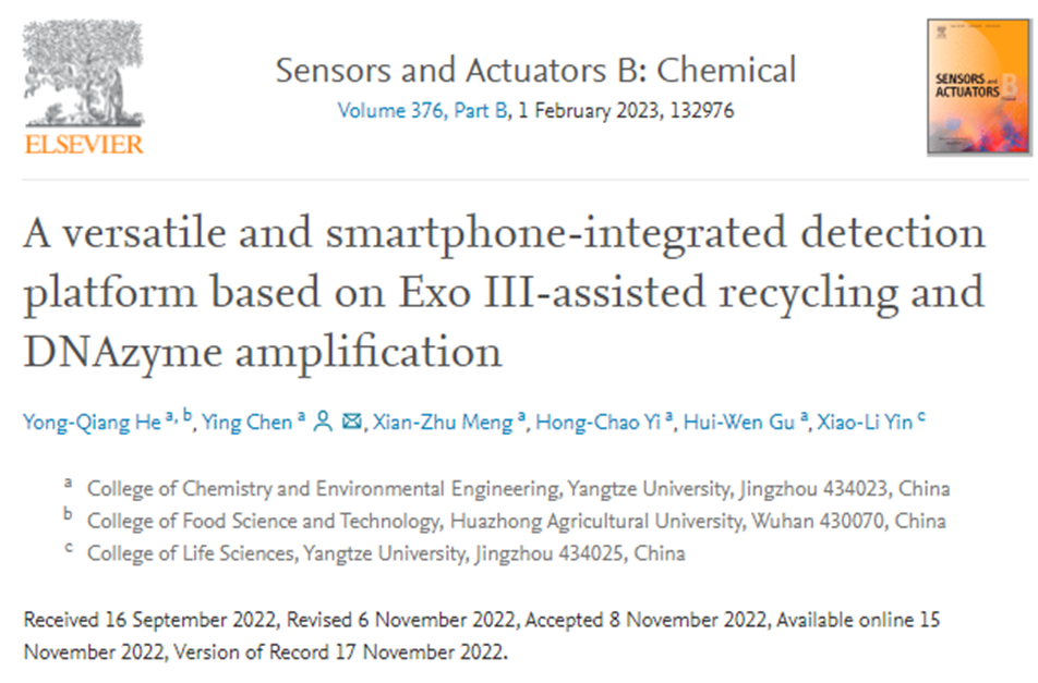 近日,yl88858永利中国陈颖教授课题组在食源性致病菌的检测方面取得重要研究进展,相关研究成果以题为“A versatile and smartphone-integrated detection platform based on ExoIII-assisted recycling and DNAzyme amplification”的学术论文发表于分析化学领域国际著名期刊《Sensors and Actuators B: Chemical》(IF=9.221,中科院一区Top期刊)上。yl8858永利集团化工学院硕士研究生贺永强为论文第一作者,陈颖教授为论文通讯作者。该研究受国家自然科学基金(21605007)和湖北省自然科学基金(2019CFB594)等项目的资助。