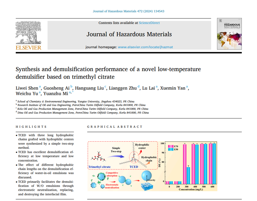 最近,《Journal of Hazardous Materials》(IF=13.6)发表了yl88858永利中国米远祝教授课题组的最新研究成果,报道了一种低温原油破乳剂的制备。论文题目为“Synthesis and demulsification performance of a novel low-temperature demulsifier based on trimethyl citrate”,硕士研究生申利伟为论文第一作者,米远祝教授为论文通讯作者。