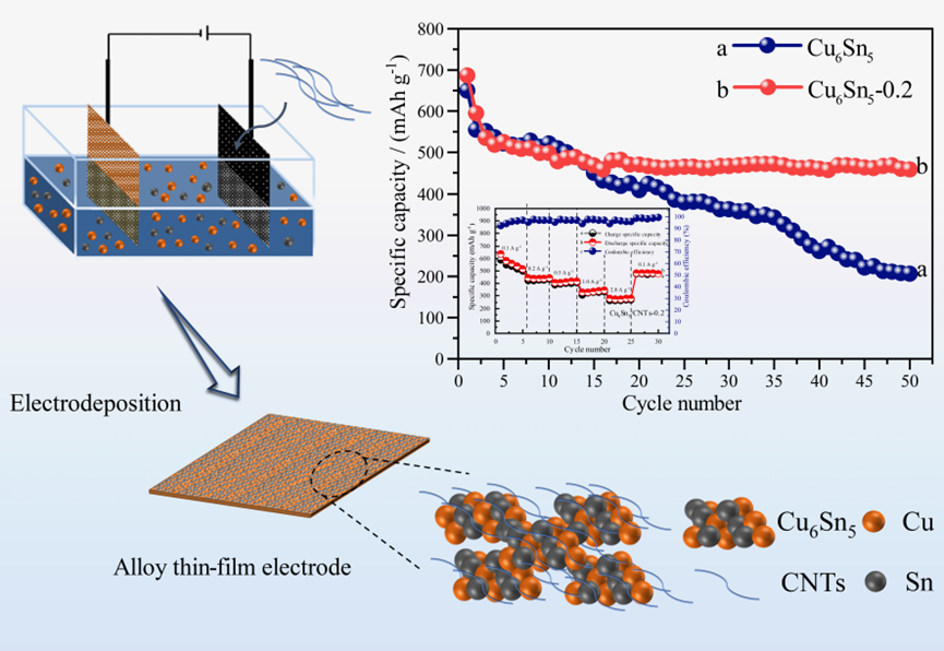 近日,《矿物冶金与材料学报》(Int. J. Miner. Metall. Mater.)发表了yl88858永利中国肖围教授课题组的最新研究成果。利用废弃印刷线路板Cu-Sn浸出液作为电沉积液,通过原位电沉积法成功制备了无粘结剂的铜锡合金/碳纳米管(Cu6Sn5/CNTs)合金薄膜电极,系统探究了电沉积液中碳纳米管(CNTs)的浓度对合金薄膜电极的影响。与传统电极制备工艺不同的是,此合金薄膜电极不需要额外添加导电剂和粘结剂便可牢固的附着在集流体铜箔上,可以进一步提升电池的体积能量密度,实现了废弃印刷线路板的资源化利用。