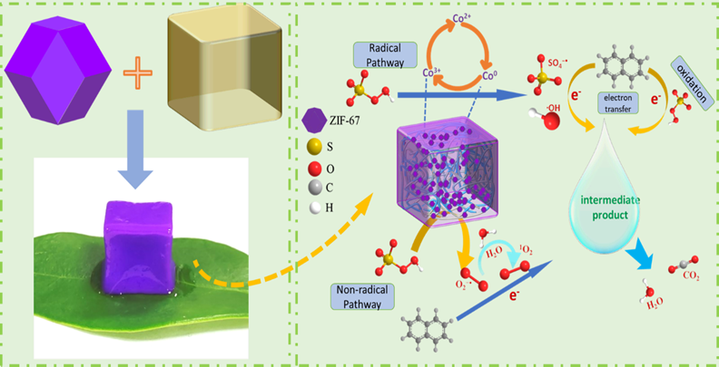 陈武教授课题组使用温和的室温水溶液作为ZIF-67@SL复合材料合成的环境,避免了有机溶剂如甲醇或乙醇的使用,避免了使用有害溶剂的环境压力。在这项研究中构建了ZIF-67@SL活化过硫酸盐(PMS)体系以降解废水中PAHs。通过催化剂表征、活性物种检测及活性位点探究,阐明了PMS的活化机理,并考察了该体系对于共存物质及复杂水体的适应性和催化剂稳定性,进一步探究了ZIF-67@SL/PMS对多组分多环芳烃的去除规律和效果。该研究为ZIF-67材料活化PMS处理高浓度PAHs废水提供了理论及实践依据,并为ZIF-67和水凝胶的资源化、高值化利用提供了新策略。
