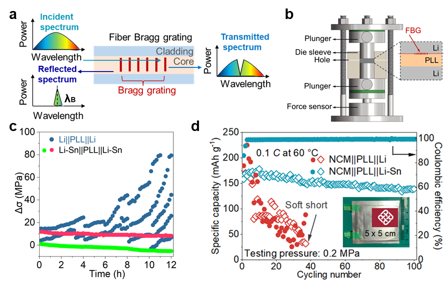 近日,yl88858永利中国李国成博士在材料科学领域取得重要研究进展,其成果" Decoding Chemo-Mechanical Failure Mechanisms of Solid-State Lithium Metal Battery Under Low Stack Pressure via Optical Fiber Sensors "发表于国际顶级学术期刊《Advanced Materials》(IF=27.4,Nature Index收录期刊,中科院一区TOP)。该研究创新性地采用布拉格光纤光栅(FBG)传感技术,首次实现全固态锂金属对称电池界面应力场分布的原位动态监测,成功解耦了低轴向压力工况下化学-机械多场耦合作用诱发的电池失效机制。此项工作开创了固态电池界面力学行为原位表征新范式,为高精度光学传感技术在新型储能器件失效分析中的工程化应用开辟了创新路径。李国成博士为论文第一作者,yl8858永利集团为论文通讯单位之一。 内容简述: 基于陶瓷-聚合物复合固态电解质的全固态锂金属电池展现出优异的储能应用前景,但其仍面临界面恶化与锂枝晶渗透等关键挑战,上述问题在低轴向压力工况下尤为严重。揭示其化学-机械耦合失效机理具有重大科学价值。本研究通过嵌入式光纤传感技术实时监测界面应力的演变与分布特征,阐明了其化学-力学耦合演化规律。研究发现,锂金属电极的不均匀溶出/沉积行为会引发界面应力的快速累积与空间异质性增长,进而加剧界面接触失效并诱发锂枝晶成核,引起电池短路失效。基于此,本工作构筑了三维锂/锂锡合金复合负极,发现该结构在低轴向压力条件下仍维持均匀的应力分布特征,实现了电化学性能的显著提升。本工作不仅构建了界面应力均匀性的原位定量表征方法体系,更为揭示全固态电池化学-力学失效机制提供了理论支撑,对高安全性固态电池体系开发具有指导意义。 该研究工作得到了香港理工大学深空探测研究项目(1-BBDC)、国家自然科学基金(52207230 和 92372109)、广州-香港联合基金项目(2023A03J0003 和2023A03J0103))等项目的支持。 图文摘要: 图(a)光纤光栅传感器工作原理示意图;(b)带有植入式光纤光栅传感器和外部压力传感器的改进型Swagelok电池示意图; (c)纯Li和Li-Sn固态对称电池前三次循环过程中的应力-时间曲线图;(d)固态软包电池的循环性能对比图。 文章链接:https://advanced.onlinelibrary.wiley.com/doi/full/10.1002/adma.202417770