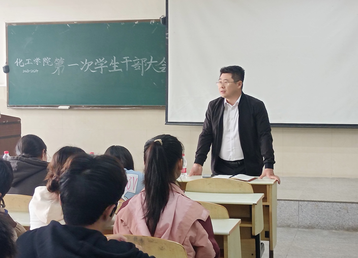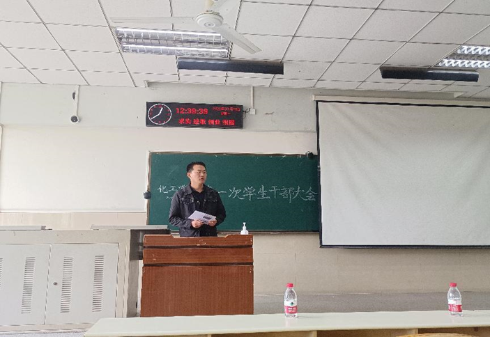党委副书记杨会军做总结发言,他提出作为学生干部三项基本要求——责任、团结、高效。他表示学生干部应当能够树立服务意识、奉献意识,加强道德修养,以身作则,号召全体学生干部凝心聚力,共同促进化工学院学生管理工作再上新台阶。